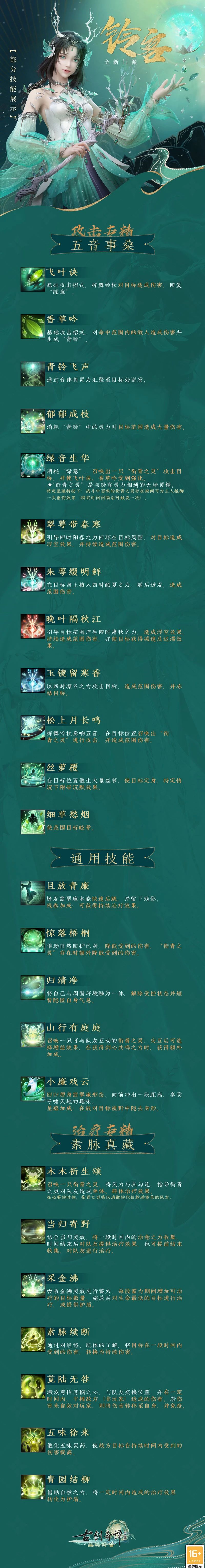 铃客目前有两种专精方向,偏向攻击的“五音事桑”和偏向疗愈的“素脉真藏”,除此之外还有部分通用技能,现在就让我们一起去了解一下铃客的门派技能吧!