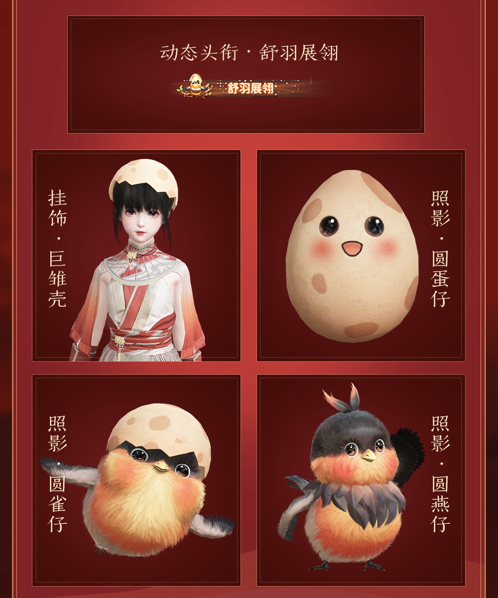 10月26日6时~11月23日6时,【礼包·舒羽展翎】限时售卖,礼包内含动态头衔·舒羽展翎、挂饰·巨雏壳、照影·圆蛋仔、照影·圆雀仔、照影·圆燕仔、时晶*2。