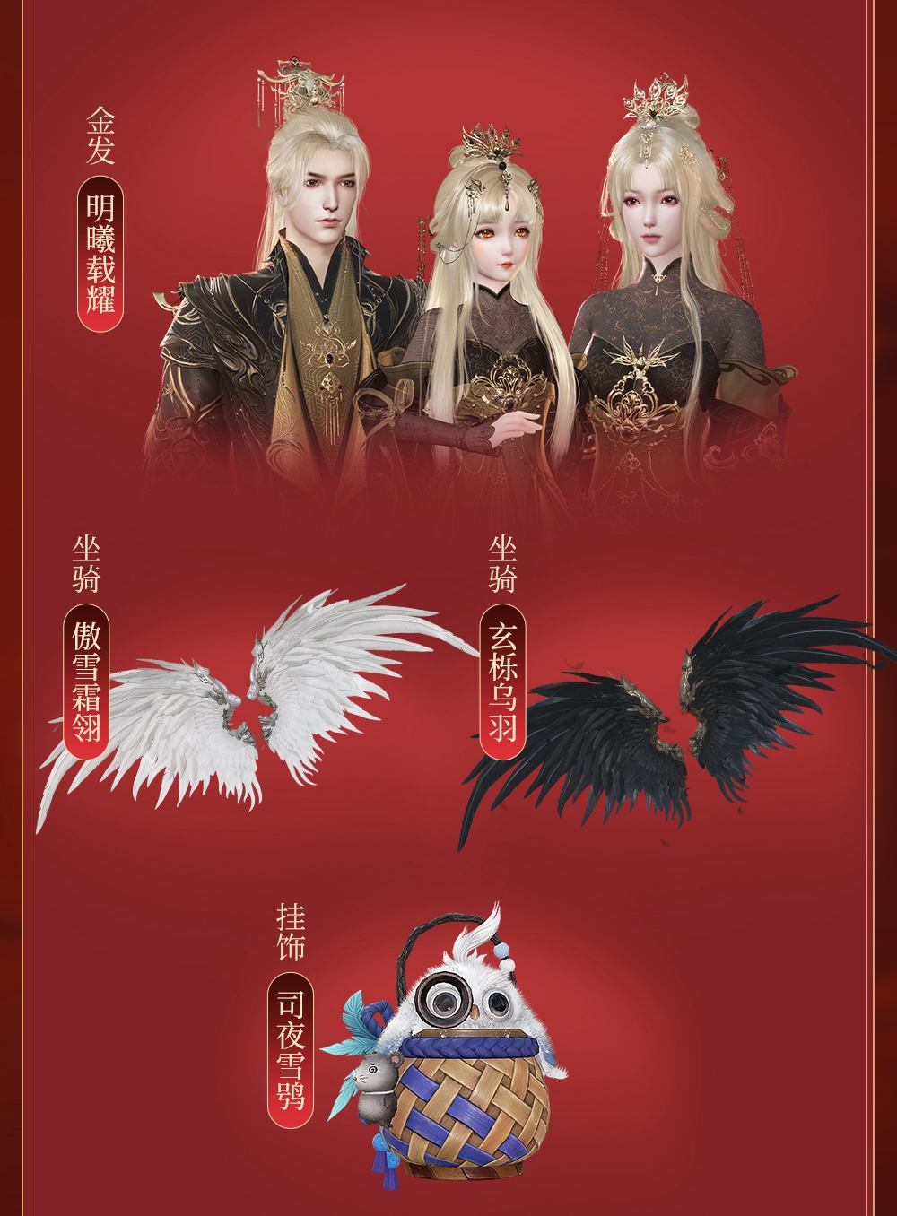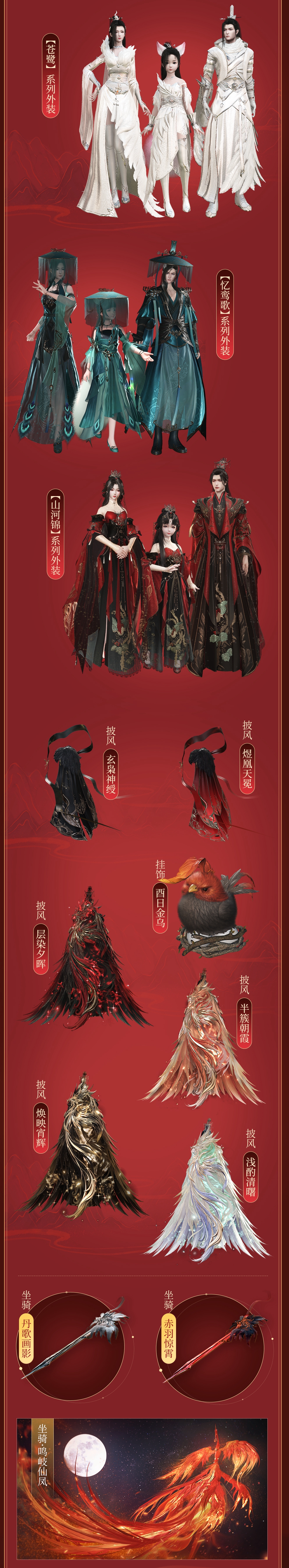 通宝商城限时折扣商品:【苍鹭】【忆鸾歌】【山河锦】系列外装、披风【焕映宵辉】【半簇朝霞】【层染夕晖】【浅酌清曙】、披风【玄枭神绶】【煜凰天冕】、坐骑【鸣岐仙凤】【赤羽惊霄】【丹歌画影】、挂饰【酉日金乌】。