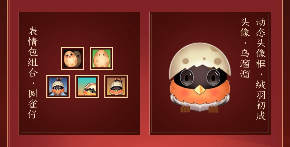 完成活动任务可获得全新限时奖励:【头像·乌溜溜】、【动态头像框·绒羽初成】、【雏雀】系列表情包。