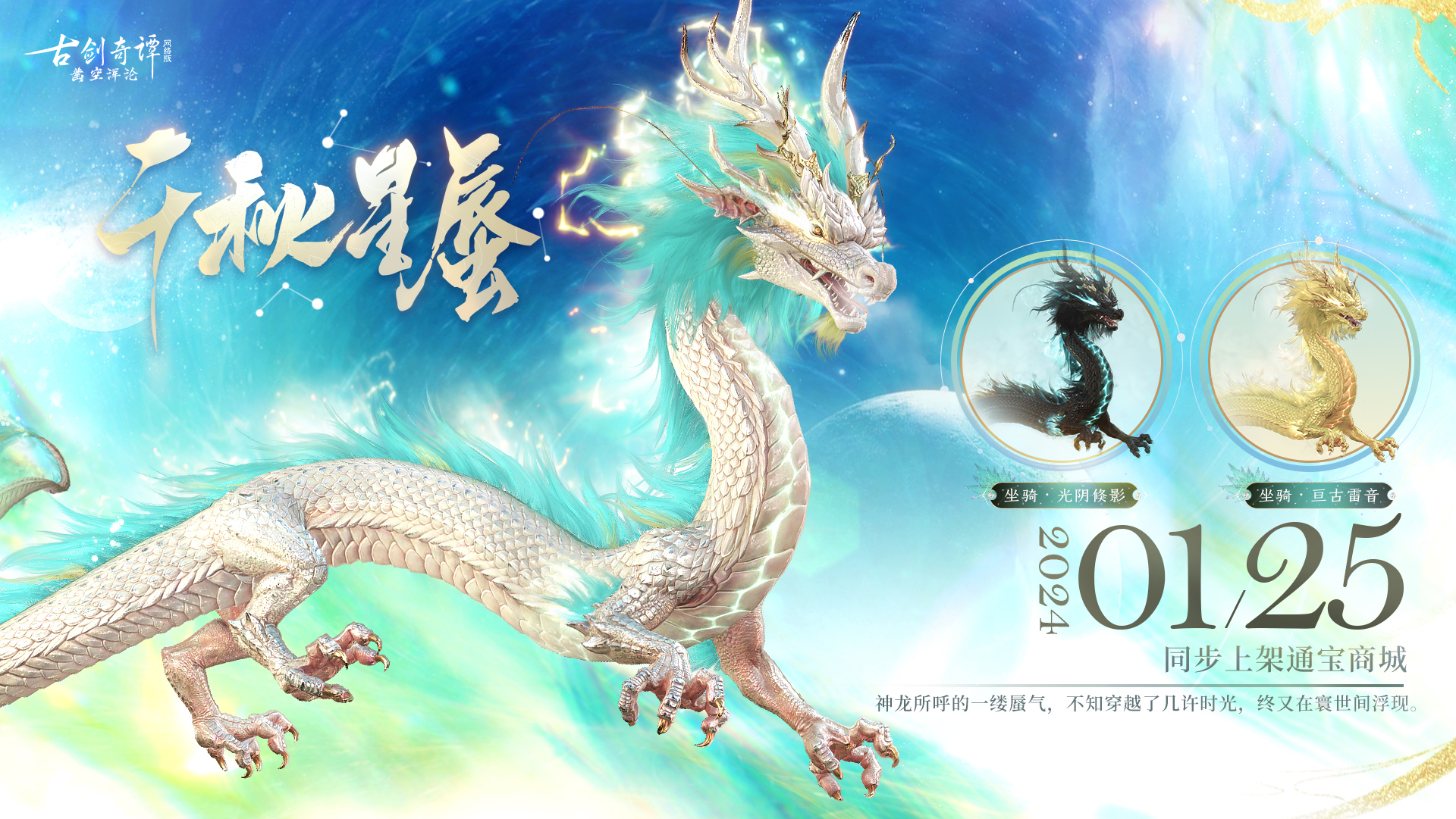 本周四1月25日更新维护后,将有三款全新主题坐骑【千秋星蜃】、【光阴倏影】、【亘古雷音】同步上架通宝商城,喜欢的仙家弟子可不要错过了哦~